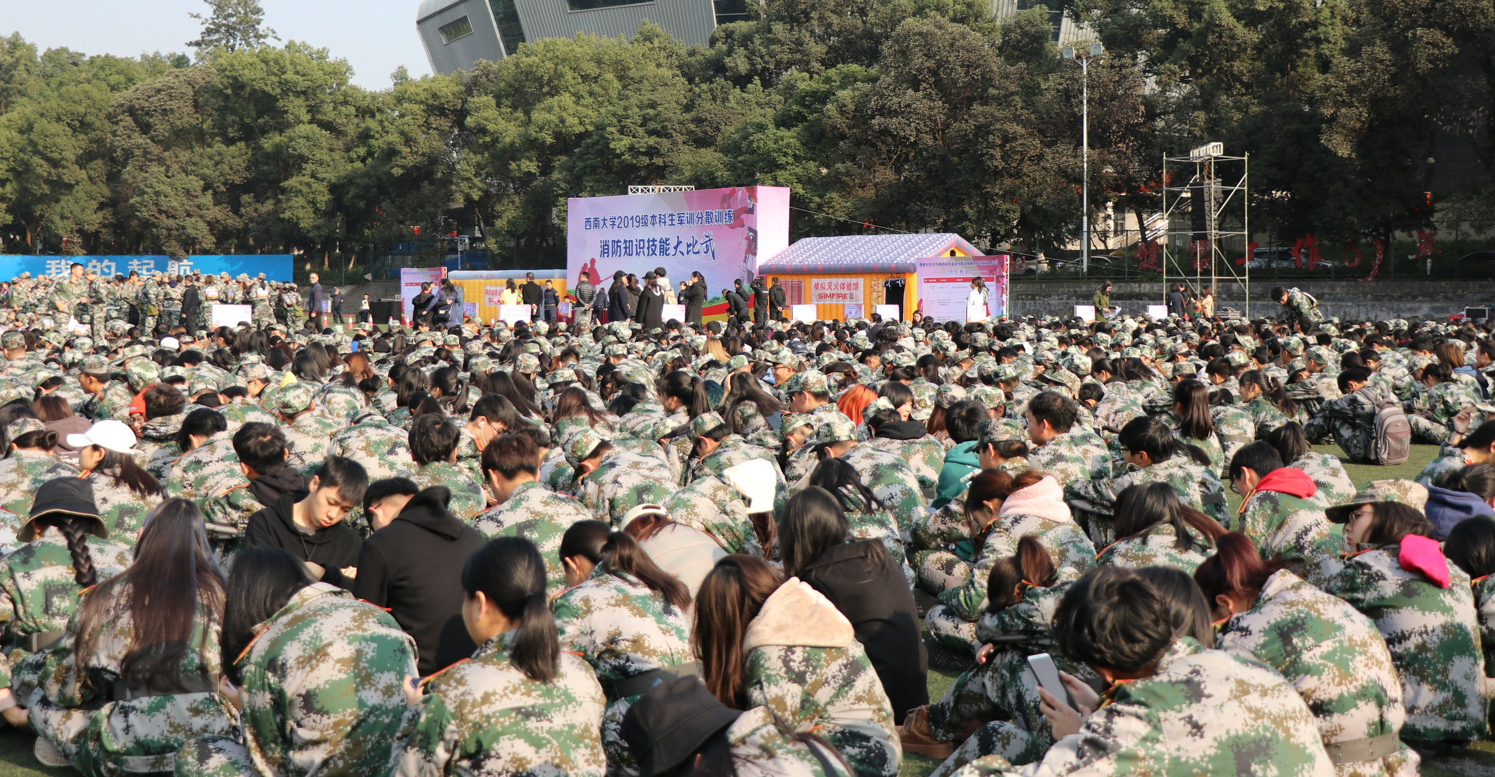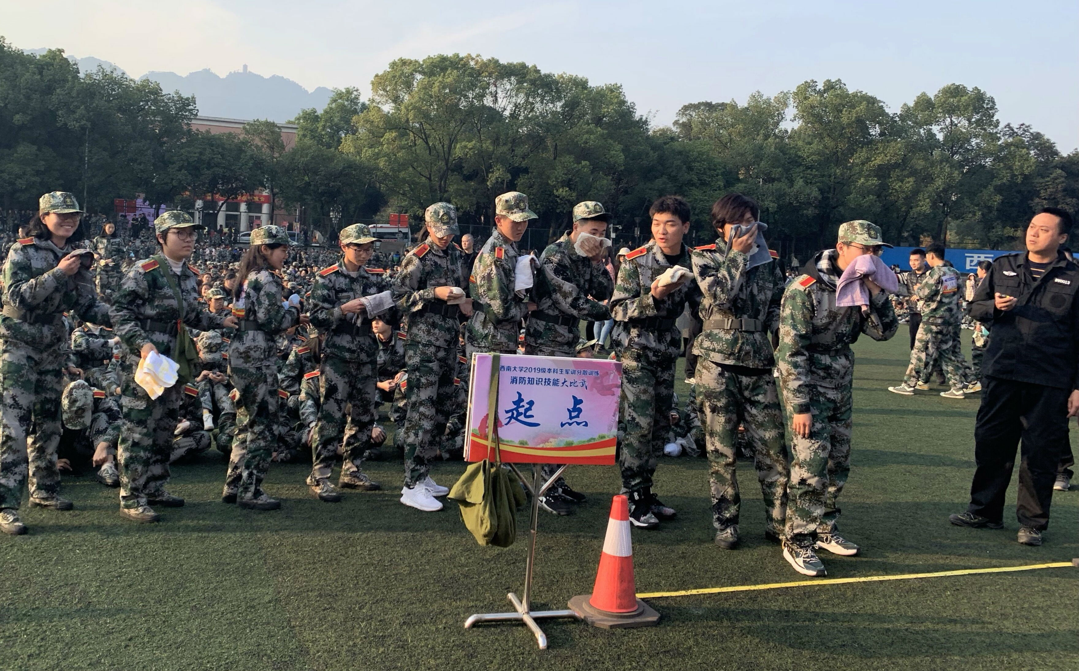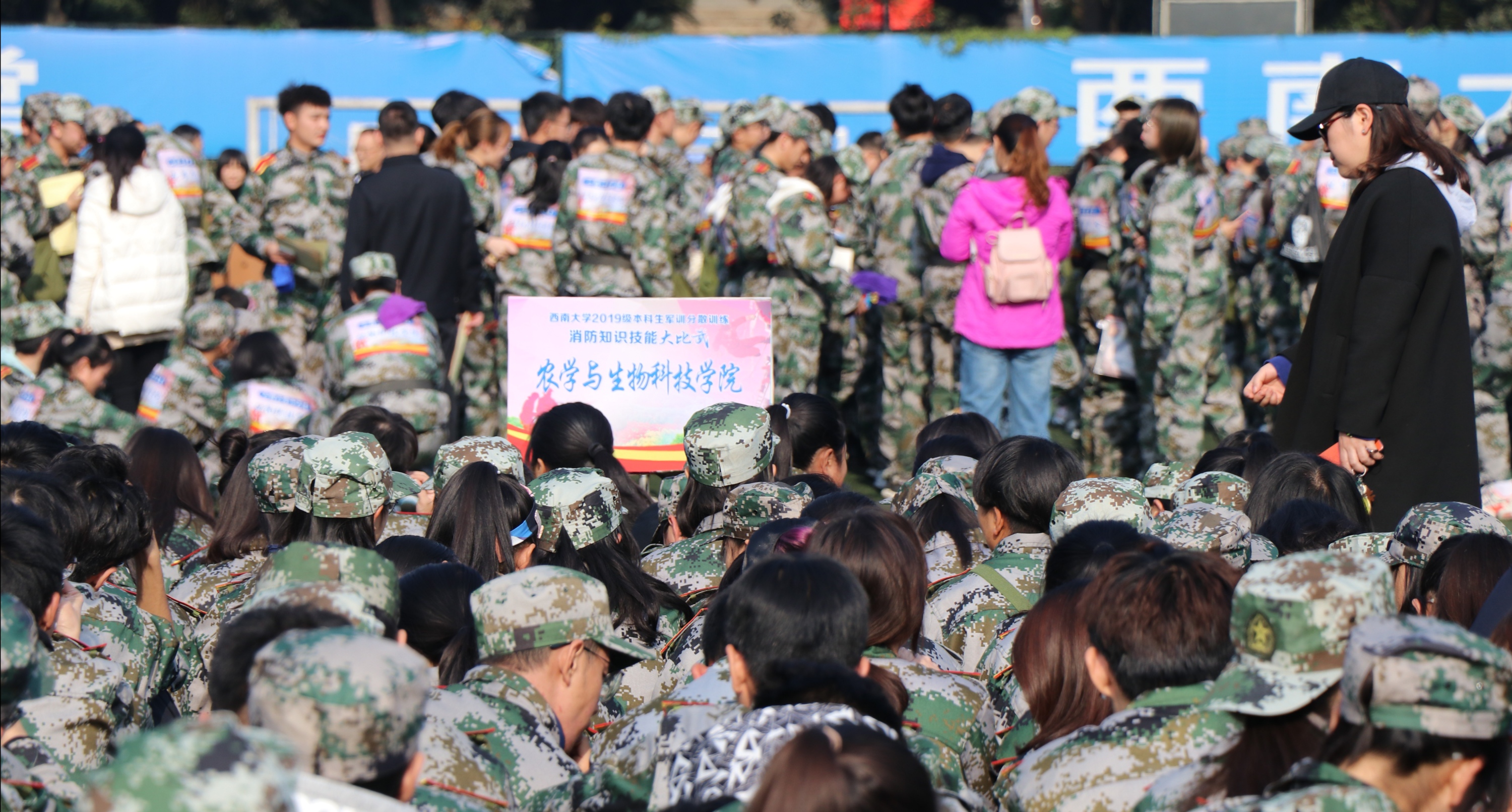 7号下午,冬日阳光照耀下的西南大学第三运动场上,聚集了全校30多个学院的2019级本科生及辅导员老师们。2019级同学们全体着军训服,一个个摩拳擦掌,“大比武”现场的气氛也随之燃了起来!