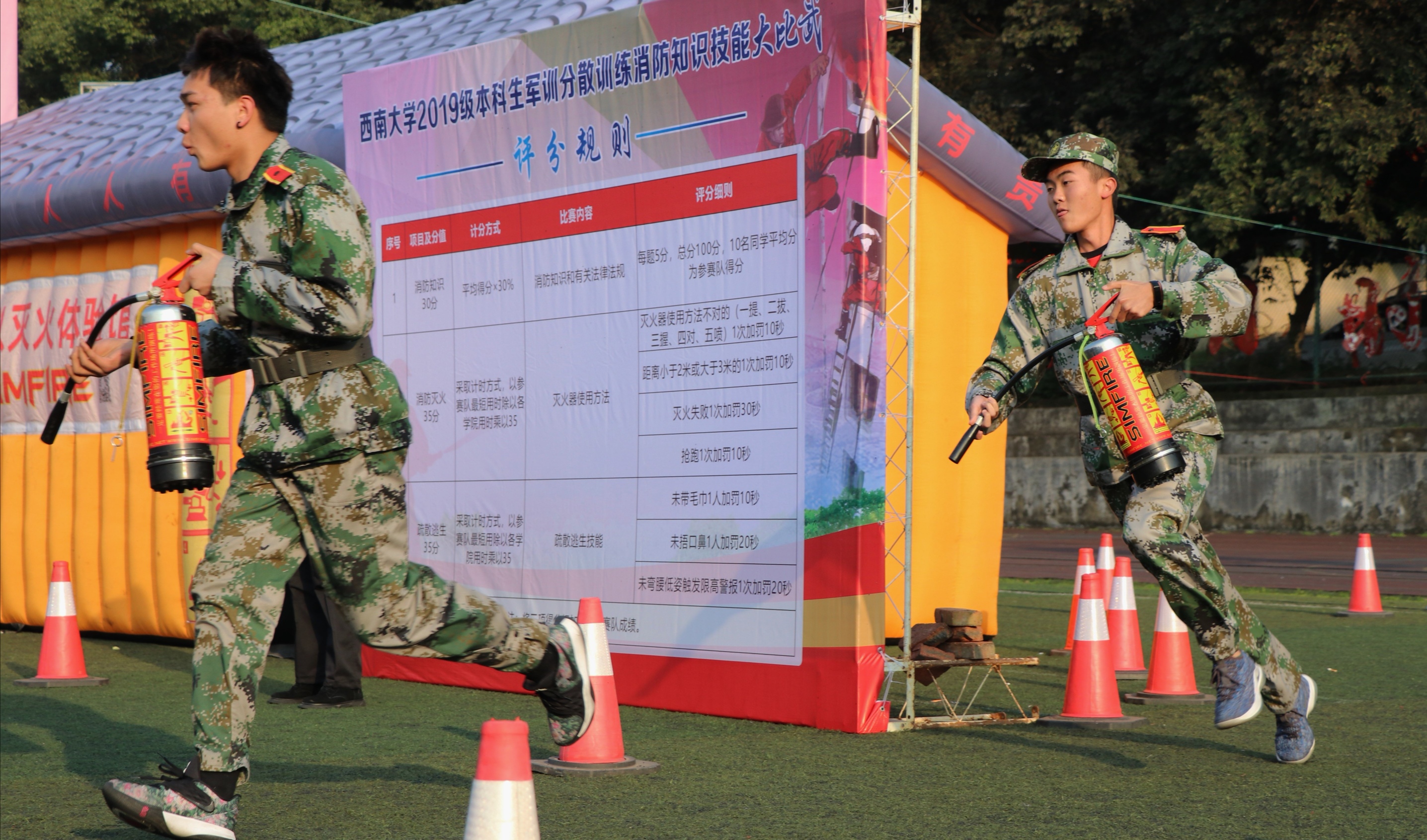 下午14:30,2019级同学列队集合完毕。各学院领队抽签决定比赛顺序后,西南大学党委副书记潘洵同志宣布消防知识技能大比武正式开始!