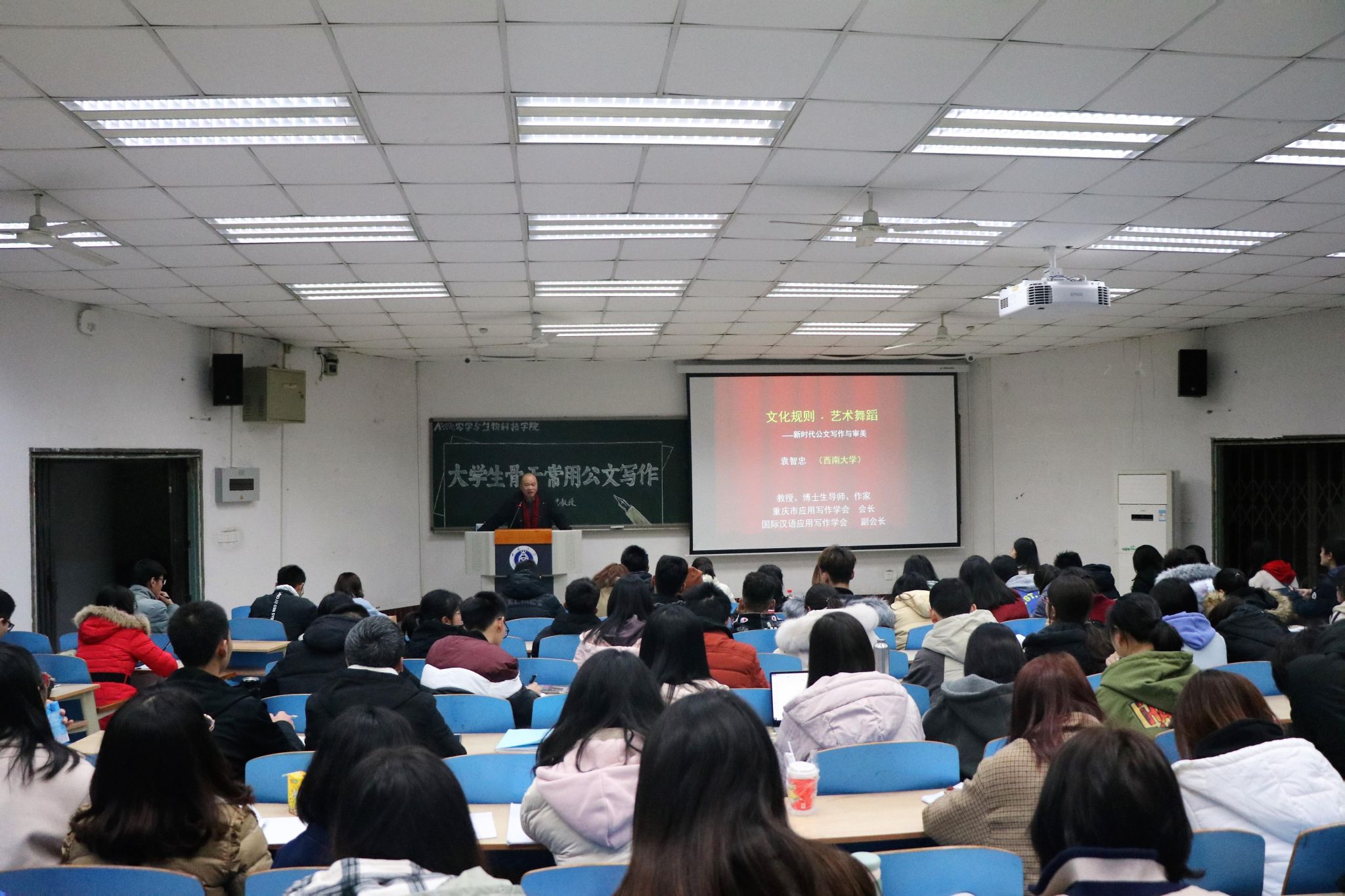 为提升我院团学骨干公文写作能力,规范各类公文写作格式,增强写作技能,学院第七期团校培训班于12月6日晚上7:00在 32教312教室举行第三次理论讲座,邀请到重庆市应用写作学会会长、国际汉语应用写作协会副会长、西南大学博士生导师袁智忠教授为团学干部做了“大学生骨干常用公文写作”专题讲座。