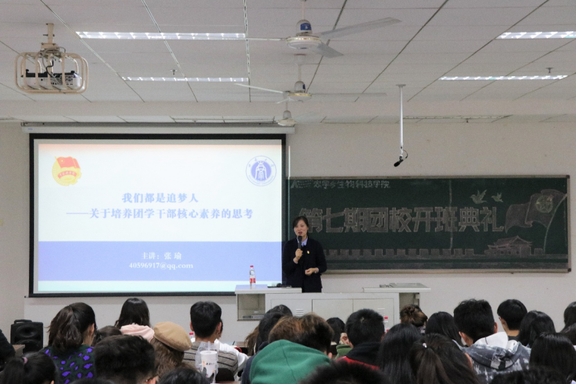 开班典礼结束后即进行团校理论讲座第一讲,校团委副书记张瑜老师主题为“我们都是追梦人——关于培养团学干部核心素养的思考”讲座,通过对西南大学“香樟计划”往期优秀学员的介绍和对学生干部应具备素质的讲解,让在场学员大大扩宽了自己的视野,对团学干部应具有的诸多素养和能力有所认识。榜样的力量让同学们更加明白学生工作的意义,也激发了大家对于努力方向的思考。