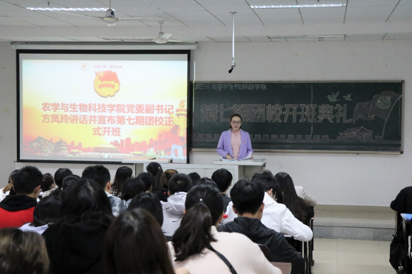 为深入学习贯彻习近平新时代中国特色社会主义思想和党的十九大精神,纪念新中国成立70周年,大力唱响礼赞新中国、奋进新时代的青春主旋律,经研究决定举办共青团西南大学农学与生物科技学院委员会团校第七期培训班,旨在选拔一批对党忠诚、信仰坚定、素质优良、作风过硬的大学生骨干。11月16日下午三点,我院于35教519教室顺利举行主题为“不忘初心担当时代责任 牢记使命勇于砥砺奋斗”的第七期团校开班典礼。校团委副书记张瑜、院党委副书记方凤玲、团委书记许莹竹以及农生院团校181名学员共同参与此次典礼,典礼由学院团委副书记李杨同学主持。