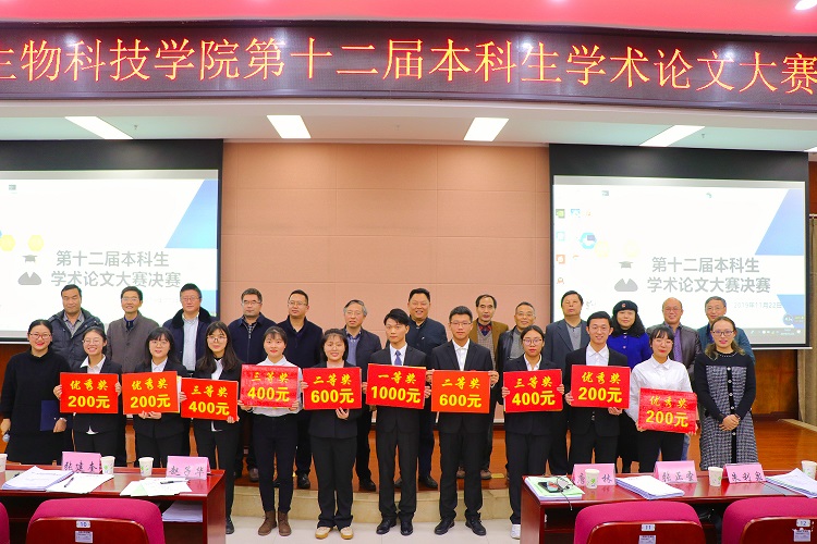 一番激烈的学术思想碰撞交流后,决赛最终评出优秀奖四名(奖金200元),三等奖三名(奖金400元),二等奖两名(奖金600元),一等奖一名(奖金1000元),最佳展演奖一名(奖金200元),指导老师也将获得相同金额奖金奖励。学院党委书记赵子华宣读比赛结果,2017级隆平班姚婉玥的作品《C2H2锌指转录因子调控水稻叶宽发育的分子机制研究》荣获最佳展演奖,2016级神农班远俊虎团队作品《利用TRV-HIGS技术鉴定核盘菌致病相关的分泌蛋白基因》荣获一等奖,团队成员范玉轩同学全英文的PPT和精彩的讲解让在场观众耳目一新;2017级隆平班万应春作品《水稻coiled-coil结构域基因DMS1的鉴定与表型分析》和2017级隆平班姚婉玥作品《C2H2锌指转录因子调控水稻叶宽发育的分子机制研究》荣获二等奖;2017级隆平班周悦作品《水稻黄绿叶突变体ygl30的表型鉴定及遗传分析》、2017级隆平班杨洋团队作品《玉米植株节间数与节间长度的表型分析与QTL定位》以及2017级隆平班彭洪娴作品《基于碘染法高效检测马铃薯直链和支链淀粉含量比的方法》荣获三等奖;2017级隆平班宫玥团队、2017级隆平班张佳宇、2018级区域一班刘玲洁、2017级隆平班邓岢莉团队荣获优秀奖。学院领导和评委老师为获奖选手颁发奖状和奖金,并合影留念。