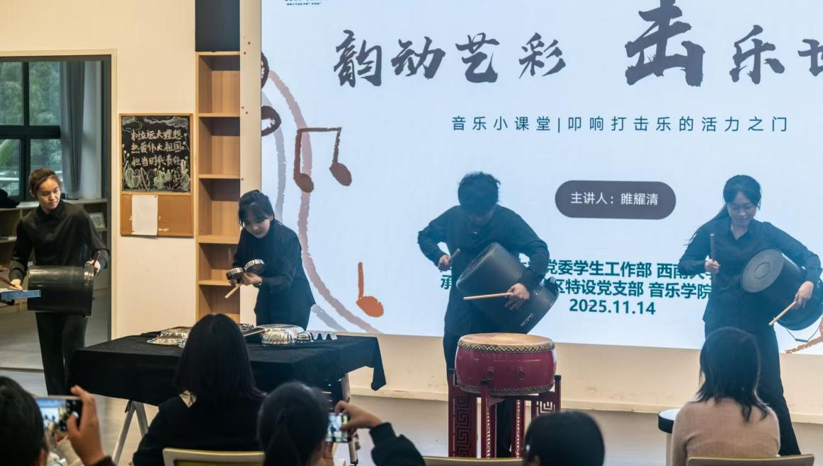 11月14日,社区文化节系列活动之学生社区审美涵育体验营在青李空间A11举办。活动以“韵动艺彩,击乐世界”为主题,通过小型打击乐器教学与互动体验,带领同学们走进节奏与韵律的艺术世界。活动由党委学生工作部、音乐学院主办,李园学生社区特设党支部、音乐学院团委学生会承办。