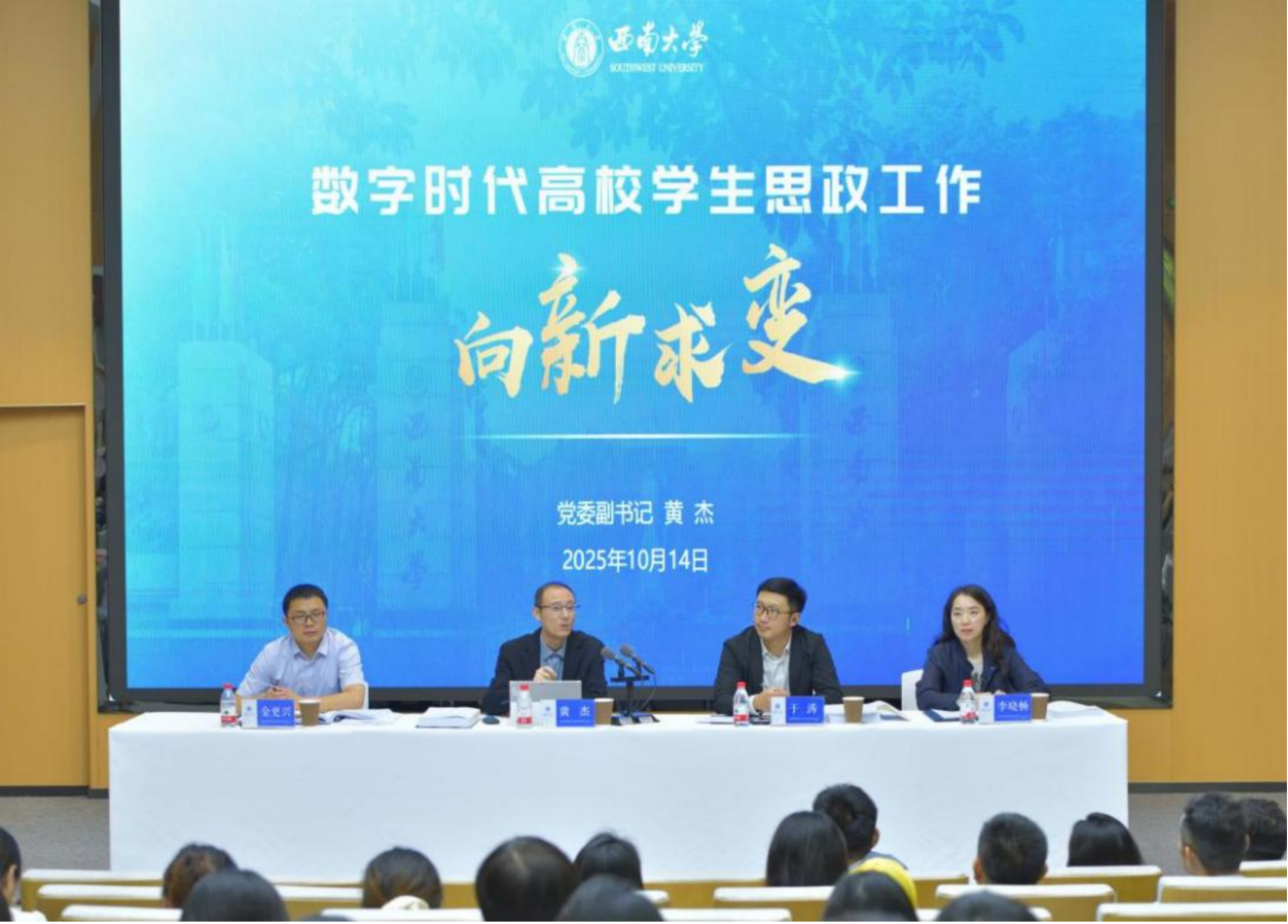 10月14日,2025年秋季学期辅导员创新发展论坛在第25教学楼一楼报告厅举行。学校党委副书记黄杰出席论坛,党委宣传部、党委学生工作部、团委以及学生职业发展与就业服务中心负责人,二级党组织副书记、全体辅导员参加论坛,在荣学工队伍在荣昌校区线上参会。论坛由校团委书记、党委学生工作部副部长于涛主持。
