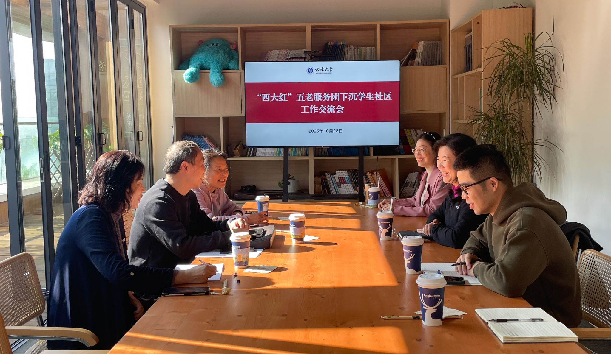 10月28日,学校在青李空间召开“西大红”五老服务团下沉学生社区工作交流会。“西大红”五老服务团弘智服务部部长毕均明、副部长何晓阳、副部长于波,党委学生工作部副部长周敏、资助育人科科长刘小艳、园区育人科科长唐飞,历史文化学院 民族学院辅导员纪蝶参加会议。会议讨论了学生社区“银发导师”计划实施举措,重点讨论了在学生社区开设学生成长发展“综合门诊”、建立“一对一”结对帮扶机制等内容。