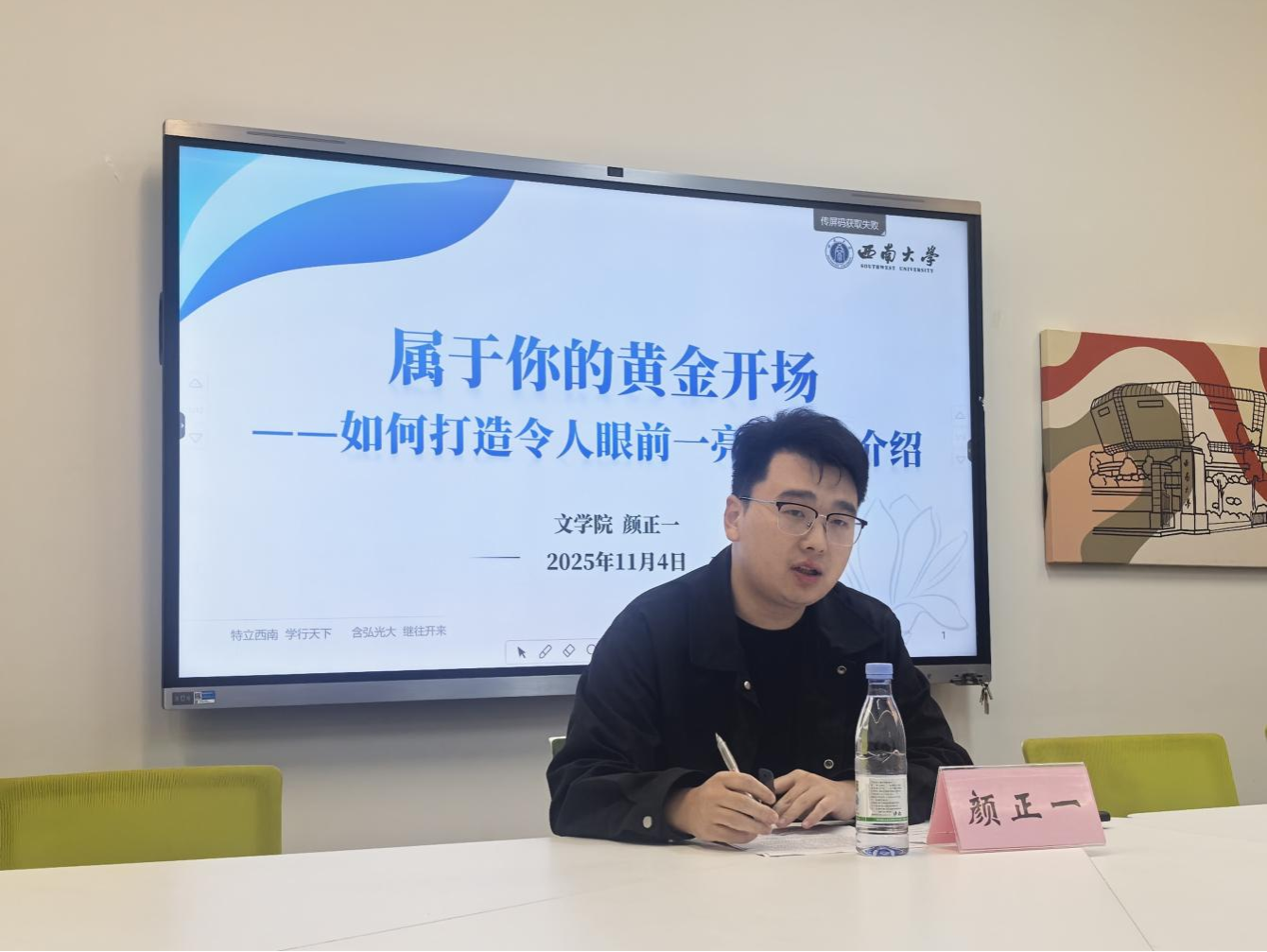11月4日,第48期辅导员园区面对面活动在青李空间举行。文学院辅导员颜正一老师围绕“属于你的黄金开场——如何打造令人眼前一亮的自我介绍”主题,为同学们讲解了自我介绍的重要性、写法、技巧、常见错误及应对等方面内容。