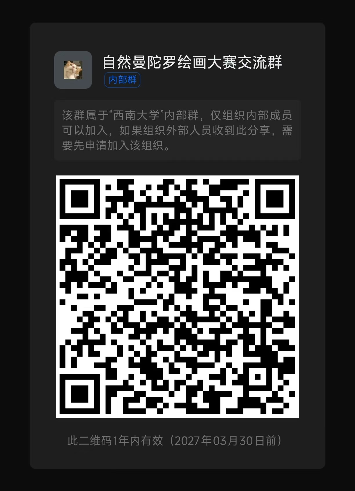 各学院(部)应高度重视、认真组织动员本院(部)学生参加曼陀罗绘画比赛,并评选优秀作品推荐至学校比赛。每个学院(部)推荐曼陀罗作品不少于3篇。各学院(部)于4月30日前将整理好的文件压缩包发送至邮箱wentipsy2025@163.com,文件名标注格式见(六、2.)。